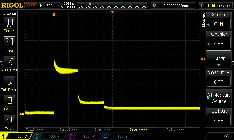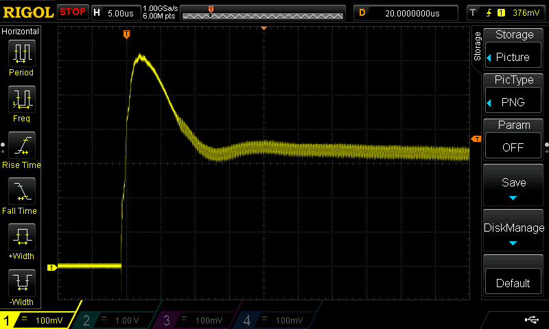 Man er­kennt auch ei­ne ge­wis­se Schwing­nei­gung de­ren Fre­quenz et­wa bei 7.5 MHz liegt. Die Schwin­gung klingt je­doch im Lau­fe von ei­ner Mil­li­se­kun­de weit­ge­hend ab.