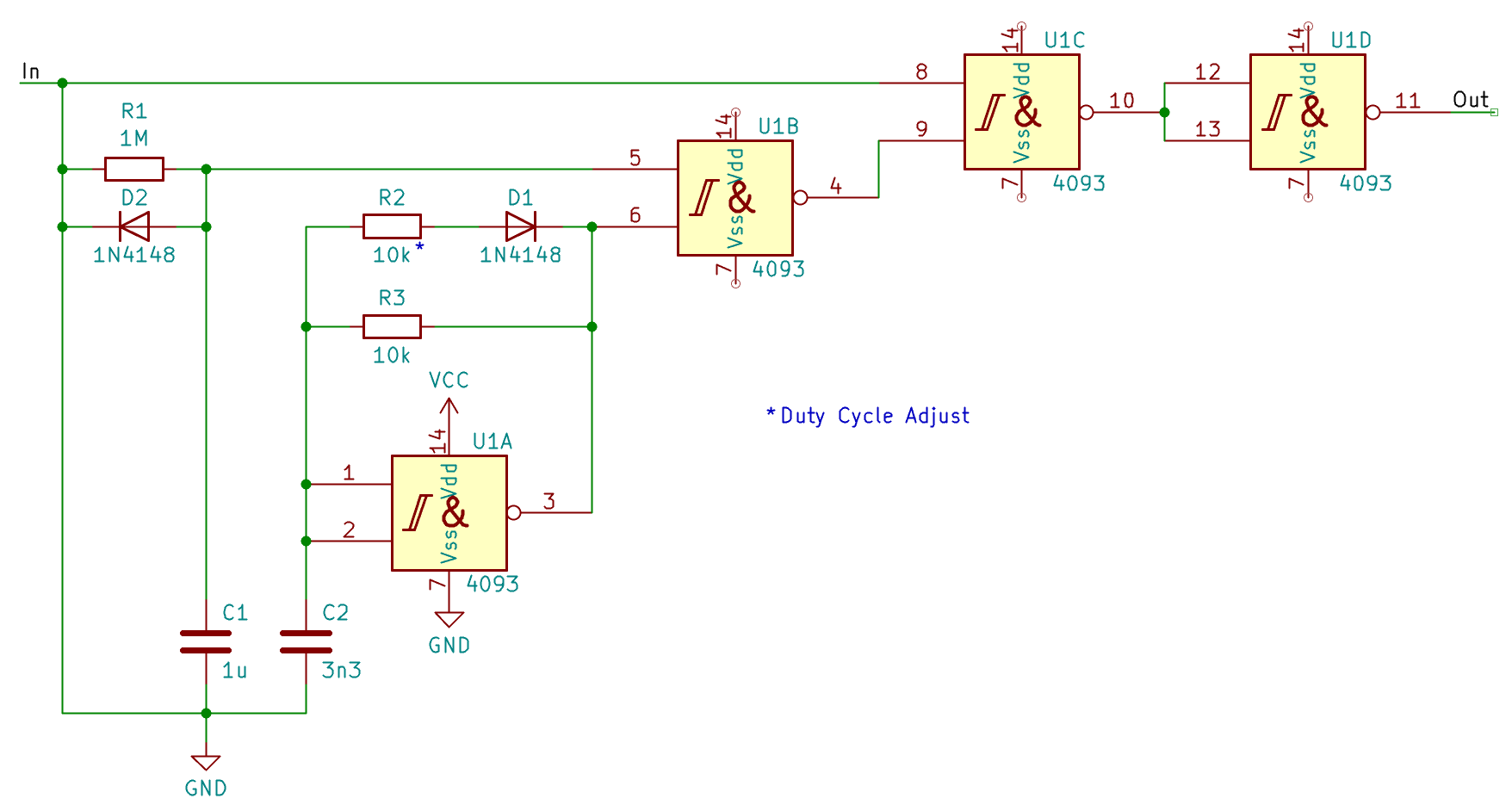 Hier nun eine Schaltung, die dies mit einem einzigen IC (einem 4093, plus ein paar Widerständen, zwei Kondensatoren und zwei Dioden) mit minimalen Kosten realisiert. Anzumerken bleibt, dass es ICs gibt (wie den DRV103), die dies mit deutlich kleinerer Leiterplattenfläche, allerdings auch zum zehnfachen Preis einfach lösen. Aber auch in der Verfügbarkeit ist das 4093 wahrscheinlich im Vorteil. Ein 4093 bekomme ich immer von irgendwo her, aber wenn beim DRV103 steht,