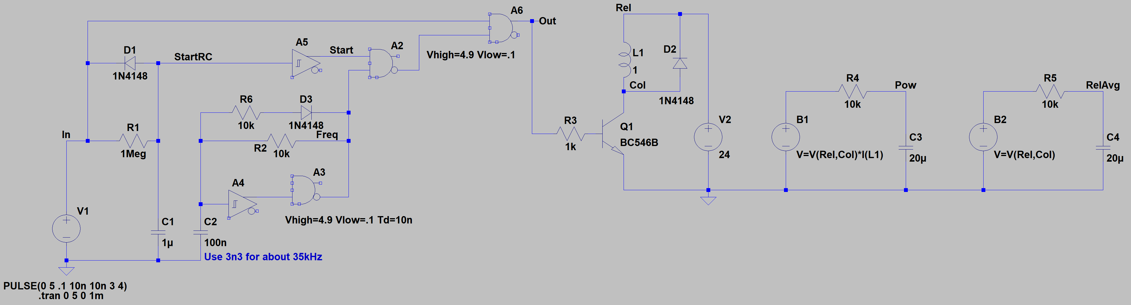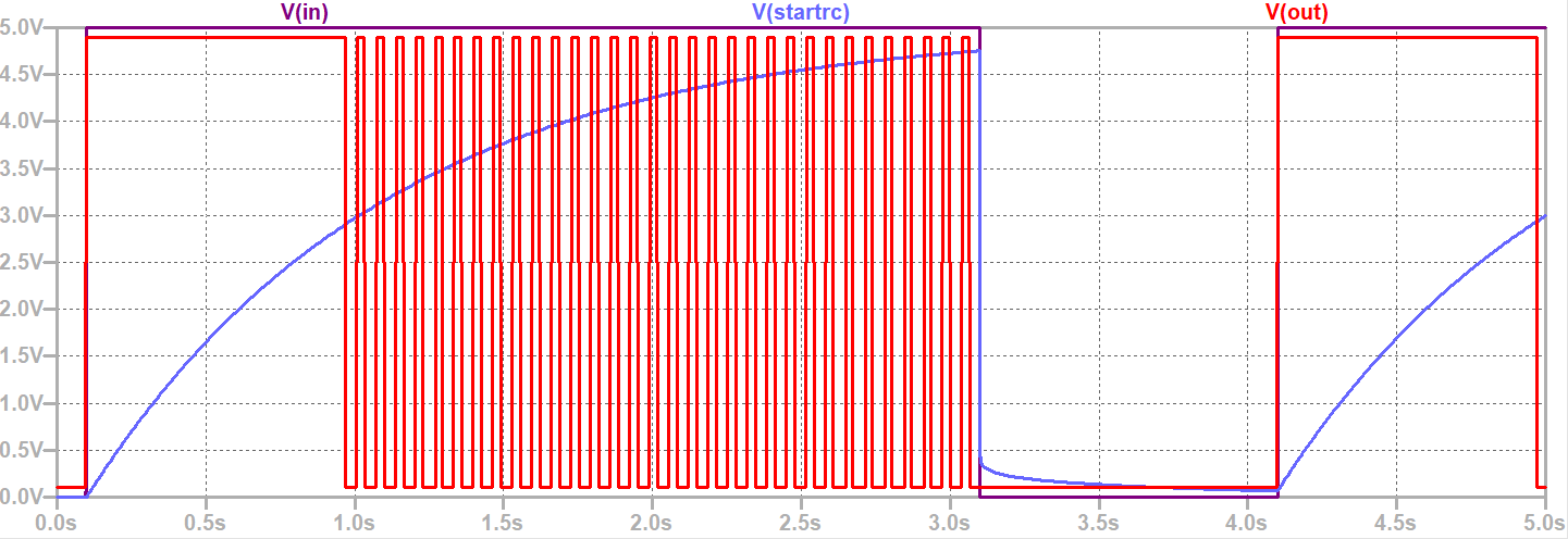R1 und C1 sorgen für die Zeit des Anzugimpulses, der durch A5 und A2 (tatsächlich nur ein Gatter des 4093, A5 ist nur nötig, weil es in LTSpice kein NAND mit Schmitt-Trigger-Eingängen gibt) digitalisiert wird.
