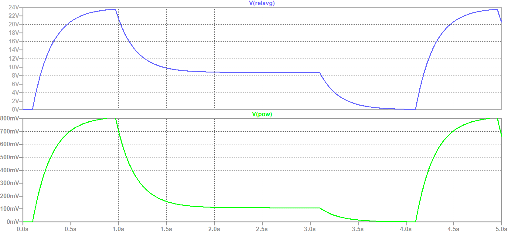Mit dieser Schaltung könnte man die Leistung etwa achteln und der Temperaturanstieg bliebe wohl deutlich unter 5°C (bisher nicht überprüft) und das Relais bliebe trotzdem sicher angezogen. Im Bild sehen Sie die abgesenkte Spulenspannung und entsprechend auch die Verlustleistung (1 mV an Pow≙1 mW), die grob bei etwa einem Achtel liegt.