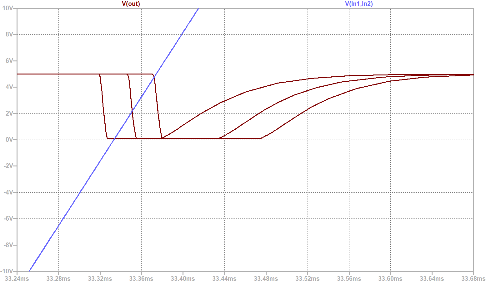Durch den extrem hohen Widerstand können parasitäre Kapazitäten selbst von 100 pF (Cpar im Schaltplan, im Diagramm sehen sie 0 pF, 50 pF und 100 pF) das Ergebnis beeinflussen aber wir liegen immer noch besser als die Schaltung mit Optokoppler und Widerstand.